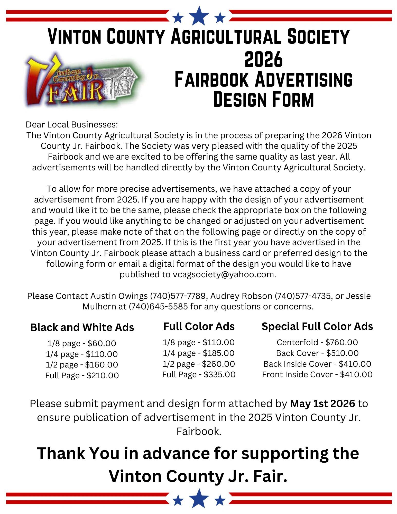 The fairbook serves as both a guide and a keepsake for visitors. Advertising within it allows businesses to connect with the community while helping fund events, exhibits, and activities that make the fair possible. We greatly appreciate the support of our advertisers.